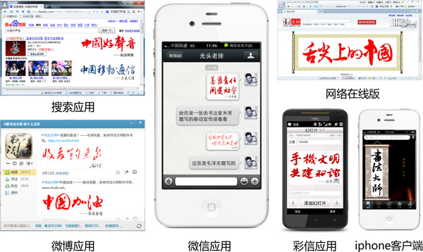 基于古今中外著名书法家1200余人的原迹制作的矢量化字体、另外包括如儿童、女性、老人等多种不同风格个性化字体。软件包括安卓版、苹果手机版、wap版。特别适用于发送个性彩信、微信、手机邮件。可嵌入搜索、即时、通讯博客、输入法、微博、邮件、通用型平台系统,提供用户友好的个性字体及书法解决方案。我们的愿景是让人人都使用、让书法字体在网上到处可见。